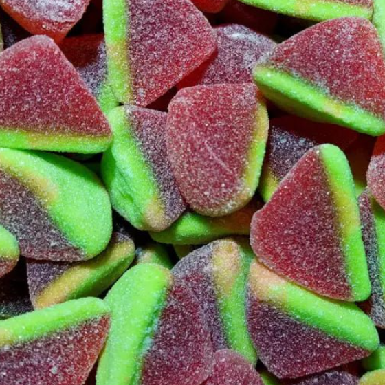 Watermelon flavoured, sugar coated lolly with a goey jelly inside