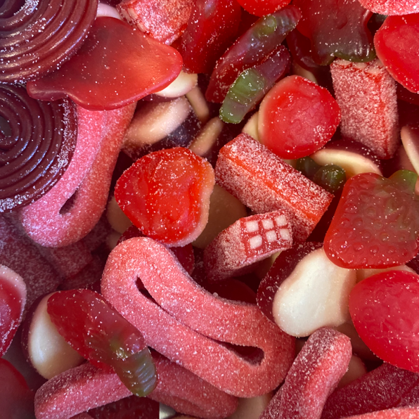 A selection of Strawberry flavoured lollies all mixed together, both sweet and sour