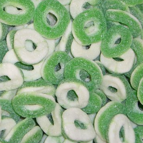Ring shaped lollies with a strong apple flavour, coated in sour sugar